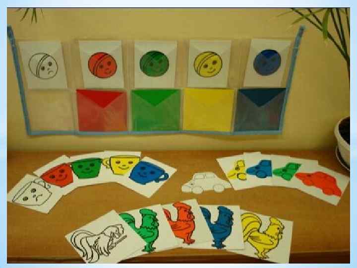 «Түстерді ажырат» Мақсаты: балалардың көру, есте сақтау және ойлау қабілеттерін дамыту. Ойын барысы: түрлі-түсті конверттер беріледі. Балалар конверттердің ішіне суреттерді салады. Олардың түсі конверттің түсіне сәйкес келу керек. «Бұл не? » ойыны. Мақсаты: негізгі ерекшеліктері бойынша заттарды ажырату, жеміс-жидектер туралы білімдерін бекіту. Барысы: бір балаға жеміс суретін көрсетіп, ол жемісті қалған балаларға жасырады. Мысалы: тәтті, түсі қызыл, дөңгелек пішінді болады. Жауабы: алма. Алмұрт, лимон, банан, шие, т. б.