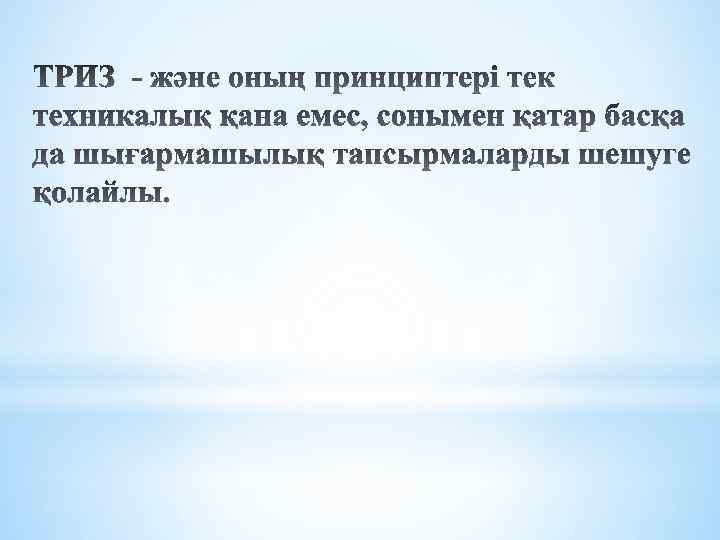 ТРИЗ технологиясы тәрбиешіге де , балаға да жас шамасына қарамай меңгеретін шығармашылық құралы болып табылады. Бір құралды пайдаланатын тәрбиеші де, бала да қиындықсыз бірін-бір түсіне алады. Белгілі ғалым Альберт Эйнштейннің : «Өзіңді қызықтыратын іспен айналысқаннан артық, еш нәрсе жоқ» деген қағидасы негіз болады
