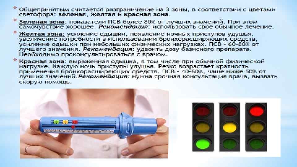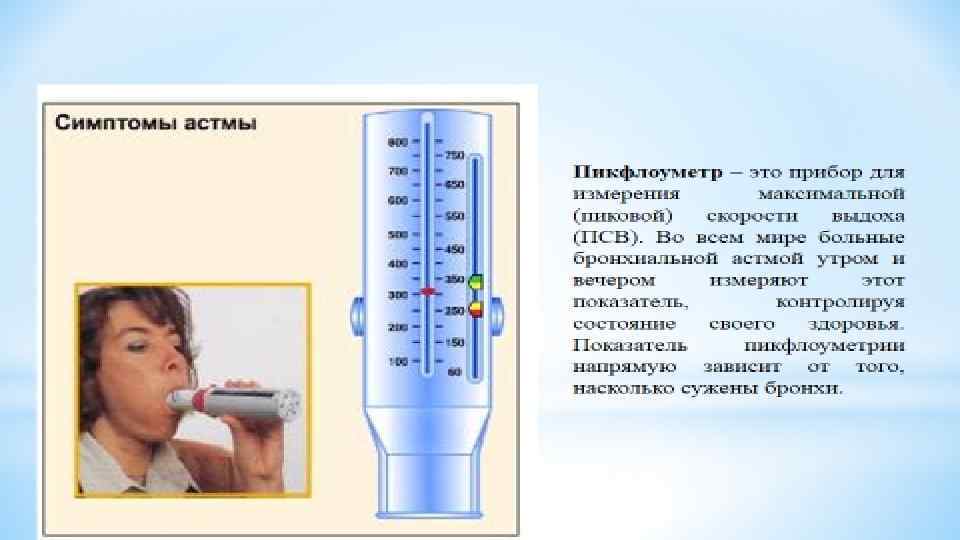Спирография является ведущим диагностическим методом и проводится путем измерения показателей во время усиленного (форсированного) выдоха. При бронхиальной астме уменьшается объем форсированного выдоха и может уменьшаться жизненная емкость легких (при среднетяжелом и тяжелом течении), также изменяется процентное соотношение объема форсированного выдоха к жизненной емкости легких. Пикфлоуметрия определяет пиковую (максимальную) скорость выдоха. Измерения проводят 2 раза в день — утром и вечером и, если разница показателей будет более 20 %, то у больного имеет место спазм гладкой мускулатуры бронхов. Степень тяжести заболевания устанавливается согласно величине разницы: легкое течение — более 20 %, при среднетяжелом течении разница находится в диапазоне 30 % - 40 %, и при тяжелом течении разница превышает 40 %. Пикфлоуметр (аппарат для измерения скорости выдоха) имеет небольшие размеры и прост в эксплуатации, что позволяет пациентам самостоятельно ежедневно в домашних условиях контролировать степень изменения своего состояния. Пневмотахография — метод графической регистрации скорости объема вдыхаемого и выдыхаемого воздуха в спокойном состоянии и с усилением (форсированием). По изменениям данных можно судить о том, на каком уровне дыхательной системы возникает препятствие прохождения воздуха (в крупных либо мелких бронхах).