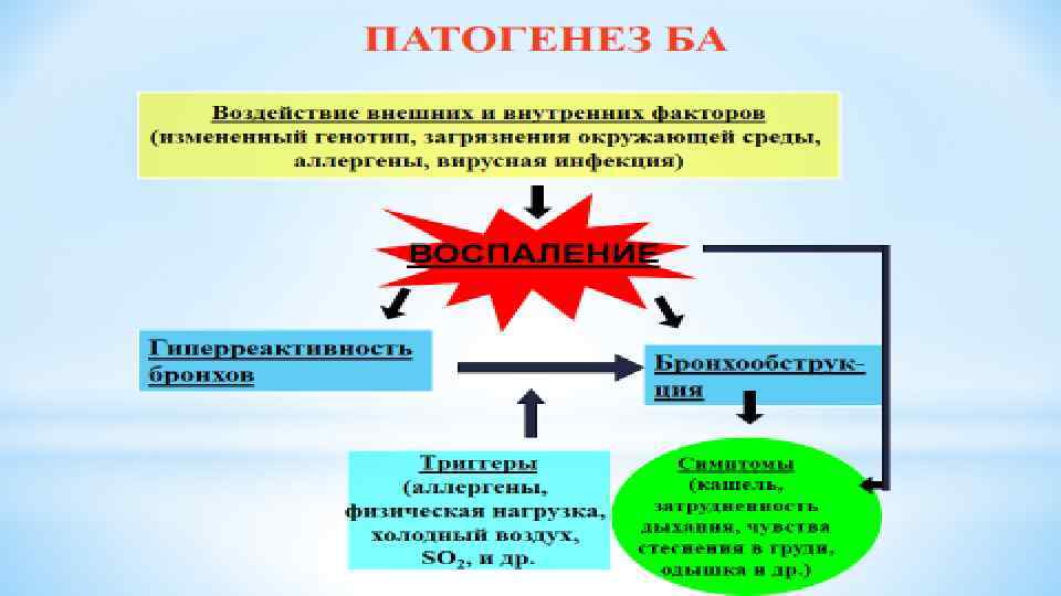 Ықпал факторлары Егер отбасында туыстардың біреуінде бронх демкіпесі байқалатын болса, балалардың демікпемен ауру қаупі артады, бұған тұқымқуалаушылық факторы тікелей әсер етеді. Сонымен қатар, тыныс алу жолдарының жоғары сезімталдығы, яғни аллерген әсеріне бронхтың аса тез немесе қатты тарылуына, науқастың жынысы да себеп болуы мүмкін. Ер балалар қыз балаларға қарағанда бронх демікпесімен жиі ауырады. Дегенмен, ересек жастағы ерлерге қарағанда әйелдерде бронх демікпесі көп тараған. Себептері Бала жасындағы демікпені таралуының артуының себептері сан алуан. Үйдің ішіндегі, сондайақ сыртындағы қоршағандардың маңыщы зор, әсіресе бұл аэроаллергендерге (кененің болуы) қатысты. Жәндіктердің, мысалы, жасыл көбелектердің, кененің, таракандардың көп болуы да демікпенің себебі бола алады. Басты себебі болып ауа-райы табылады, өйткені аллергендер тұрғылықты жердегі ауа-райы жағдайына байланысты: ылғал және жылы климат көгерулер мен кенелердің көбеюіне жағдай жасайды. Демікпені асқындыруға әкелетін қауіп факторлары үш топқа бөлінеді: алдын ала берілетін – атопия, мұрагерлік, гиперреактивтілік; себепті- шаң, жануарлар аллергендері, саңырауқұлақ, тозаң, аспирин және т. б. ; ықпал етуші-респираторлық вирустық инфекциялар, тағамдар, темекі тарту, өтімді иістер және т. б.