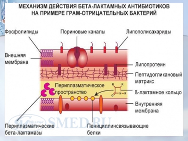 Механизм действия Цефалоспорины проявляют бактерицидное действие. Механизм этого действия связан с повреждением клеточной мембраны бактерий (подавление синтеза пептидогликанового слоя), находящихся в стадии размножения, и высвобождением аутолитических ферментов, что приводит к их гибели.