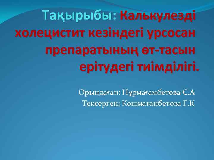 Тақырыбы: Калькулезді холецистит кезіндегі урсосан препаратының өт-тасын ерітудегі тиімділігі. Орындаған: Нұрмағамбетова С. А Тексерген: Кошмаганбетова Г. К