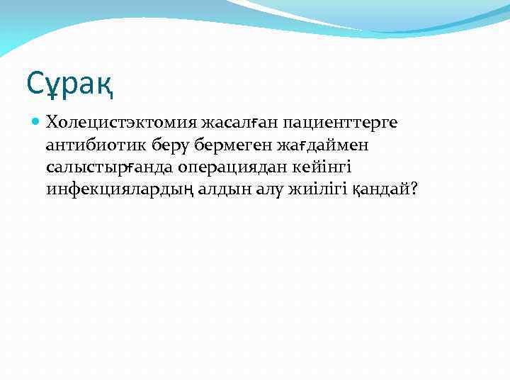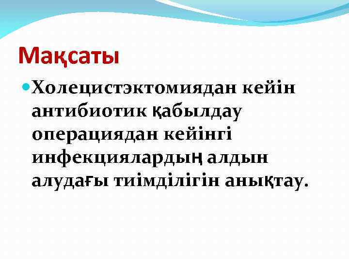 Мақсаты Холецистэктомиядан кейін антибиотик қабылдау операциядан кейінгі инфекциялардың алдын алудағы тиімділігін анықтау.