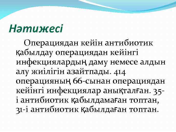 Нәтижесі Операциядан кейін антибиотик қабылдау операциядан кейінгі инфекциялардың даму немесе алдын алу жиілігін азайтпады. 414 операцияның 66 -сынан операциядан кейінгі инфекциялар анықталған. 35і антибиотик қабылдамаған топтан, 31 -і антибиотик қабылдаған топтан.