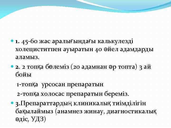 1. 45 -60 жас аралығындағы калькулезді холециститпен ауыратын 40 әйел адамдарды аламыз. 2. 2 топқа бөлеміз (20 адамнан әр топта) 3 ай бойы 1 -топқа урсосан препаратын 2 -топқа холосас препаратын береміз. 3. Препараттардың клиникалық тиімділігін бақылаймыз (анамнез жинау, диагностикалық әдіс, УДЗ)