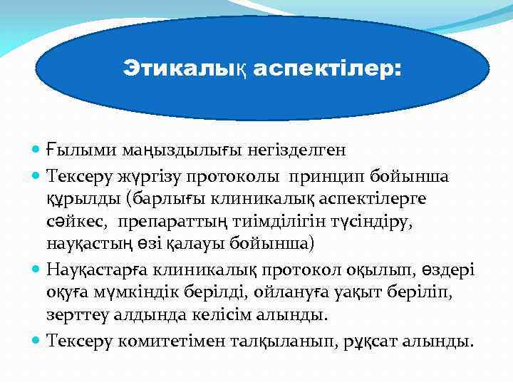 Этикалық аспектілер: Ғылыми маңыздылығы негізделген Тексеру жүргізу протоколы принцип бойынша құрылды (барлығы клиникалық аспектілерге сәйкес, препараттың тиімділігін түсіндіру, науқастың өзі қалауы бойынша) Науқастарға клиникалық протокол оқылып, өздері оқуға мүмкіндік берілді, ойлануға уақыт беріліп, зерттеу алдында келісім алынды. Тексеру комитетімен талқыланып, рұқсат алынды.