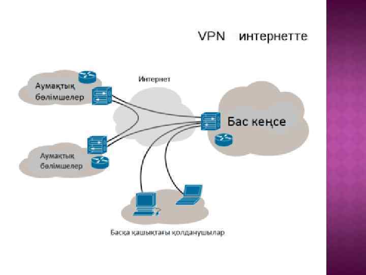 Бір орталықтан басқарылатын желі - мұнда бір компьютер – сервер желі жұмысын басқарады. Сервер – арнайы программалық жабдықтама орналасқан дискілерінің көлемі үлкен, әрі қуатты компьютер. Ø Бір деңгейлі компьютерлер желісі – мұнда желіні басқаруда барлық компьютерлер тең құқықты болып саналады. Клиент – өзіне қызмет көрсетуді сұрайтын объект (компьютер немесе программа). Сервер – басқаға қызмет көрсе-тетін объект Ø