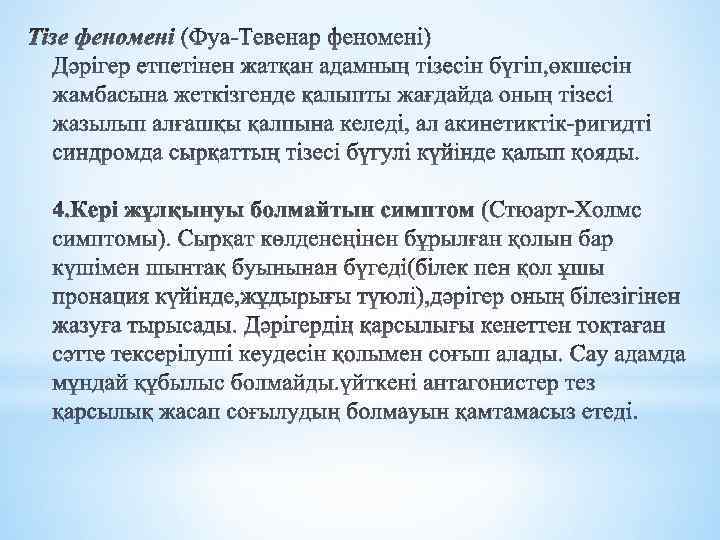 * Клиникалық көрінісі: бұлшықет ригидтілігі тремор. затухание ахейрокинез