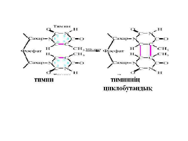 Жарықтық РЕПАРАЦИЯ • Бұл репарации кезінде бастапқы ДНҚ құрылымы тікелей қалпына келеді, өзгерген учаскелері түзеледі. Мысалы, пиримидиндік димерлердің фотореактивация. • Фотолиаза ферментінің қатысуымен жүреді, көзге көрінетін күн сәулелернің әсерінен фотолиаза ферменті активтелінеді. Димерлерді табады, олармен байланысып, қалпына келтіреді.
