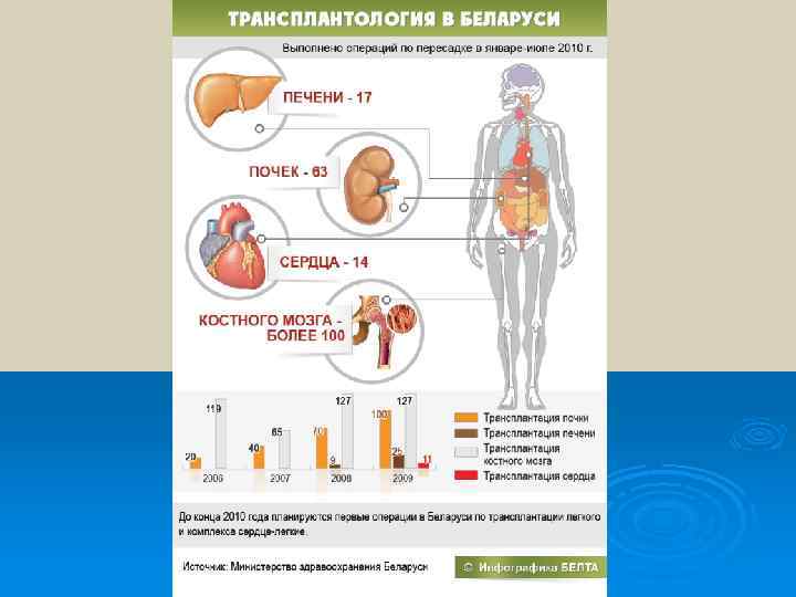 Дүние жүзінде 2000 жылға дейін 130 мыңнан астам бүйрек трансплантациясы; Ø 6000 -дай жүрек трансплантациясы; Ø 4000 -нан астам бауыр трансплантациясы; Ø 1500 -дей ұйқы безінің трансплантациясы жасалды. Бүйрек трансплантациясы жасалған соң, науқастың өмір сүруінің ұзақ байқалған кезеңі 25 жыл құрайды; Ø жүрек трансплантациясынан кейін – 15 жыл; Ø бауыр трансплантациясында – 12 жыл; Ø ұйқы безінің трансплантациясында – 6 жыл.