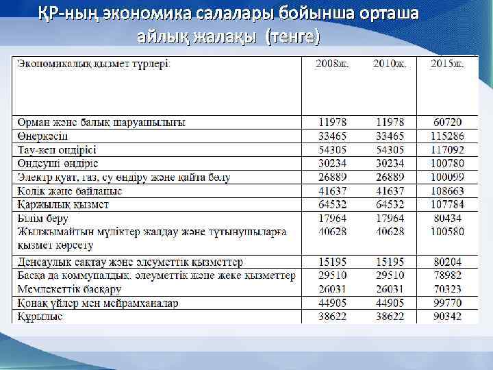 ҚР-ның экономика салалары бойынша орташа айлық жалақы (тенге)