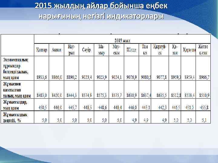 2015 жылдың айлар бойынша еңбек нарығының негізгі индикаторлары