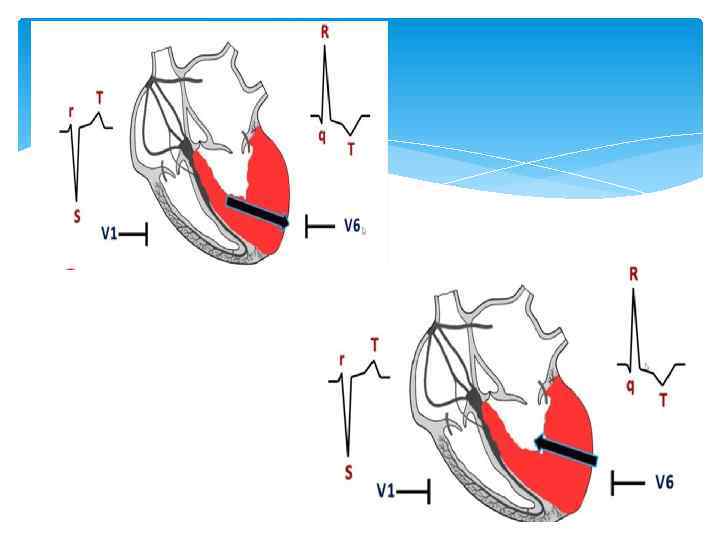 Оң қарыншаның гипертрофиясы 1. R тісшесі V 1, V 2>7 мм биік. 2. S-тісшесі V 5, V 6>7 мм терең. RV 1+S V 5(V 6) >11 мм. 3. T-тісшесі V 1 -теріс, ал ST –сегменті изолиниядан төмен, V 5, V 6 -изолиниядан жоғары. 4. ЖЭО –оңға ығысқан.