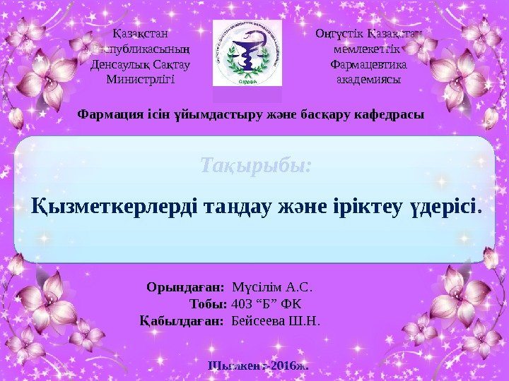 Та ырыбы: қ ызметкерлерді та дау ж не іріктеу дерісі. Қ ң ә ү Шымкент-2016 ж. Фармация ісін йымдастыру ж не бас ару кафедрасы ұ ә қ аза стан Қ қ Республикасыны ң Денсаулы Са тау қ қ Министрлігі О т стік аза стан ң ү Қ қ мемлекеттік Фармацевтика академиясы Орында ан: ғ М сілім А. С. ү Тобы: 403 “Б” ФК абылда ан: Қ ғ Бейсеева Ш. Н.