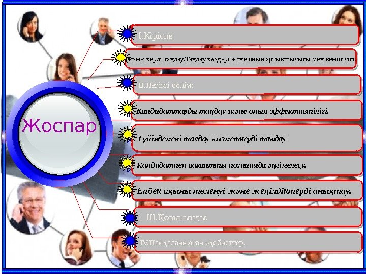 I. Кіріспе Жоспар II. Негізгі б лім: ө Кандидатпен вакантты позицияда гімелесу. әң Е бек а ыны т ленуі ж не же ілдіктерді аны тау. ң қ ө ә ң қ IV. Пайдаланыл ан дебиеттер. ғ ә III. орытынды. Қ 4 3 Т йіндемені талдау ызметкерді та дау ү қ ңКандидаттарды та дау ж не оны эффективтілігі. ң ә ң 21 ызметкерді та дау. Та дау к здері ж не оны арты шылы ы мен кемшілігі. Қ ң ң ө ә ң қ ғ