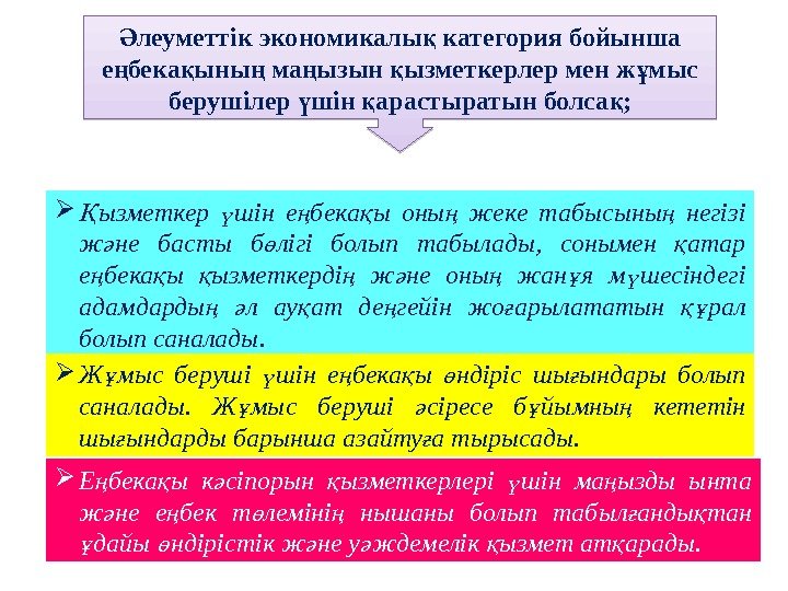 леуметтік экономикалы категория бойынша Ә қ е бека ыны ма ызын ызметкерлер мен ж мыс ң қ ң ң қ ұ берушілер шін арастыратын болса ; ү қ қ ызметкер шін е бека ы оны жеке табысыны негізі Қ ү ң қ ң ң ж не басты б лігі болып табылады, сонымен атар ә ө қ е бека ы ызметкерді ж не оны жан я м шесіндегі ң қ қ ң ә ң ұ ү адамдарды л ау ат де гейін жо арылататын рал ң ә қ ң ғ құ болып саналады. Ж мыс беруші шін е бека ы ндіріс шы ындары болып ұ ү ң қ ө ғ саналады. Ж мыс беруші сіресе б йымны кететін ұ ә ұ ң шы ындарды барынша азайту а тырысады. ғ ғ Е бека ы к сіпорын ызметкерлері шін ма ызды ынта ң қ ә қ ү ң ж не е бек т леміні нышаны болып табыл анды тан ә ң ө ң ғ қ дайы ндірістік ж не у ждемелік ызмет ат арады. ұ ө ә ә қ қ