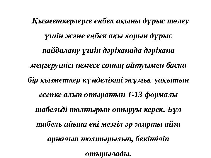 ызметкерлерге е бек а ыны д рыс т леу Қ ң қ ұ ө шін ж не е бек а ы орын д рыс ү ә ң қ қ ұ пайдалану шін д ріханада д ріхана ү ә ә ме герушісі немесе соны айтуымен бас а ң ң қ бір ызметкер к нделікті ж мыс уа ытын қ ү ұ қ есепке алып отыратын T-13 формалы табельді толтырып отыруы керек. Б л ұ табель айына екі мезгіл р жарты ай а ә ғ арналып толтырылып, бекітіліп отырылады.