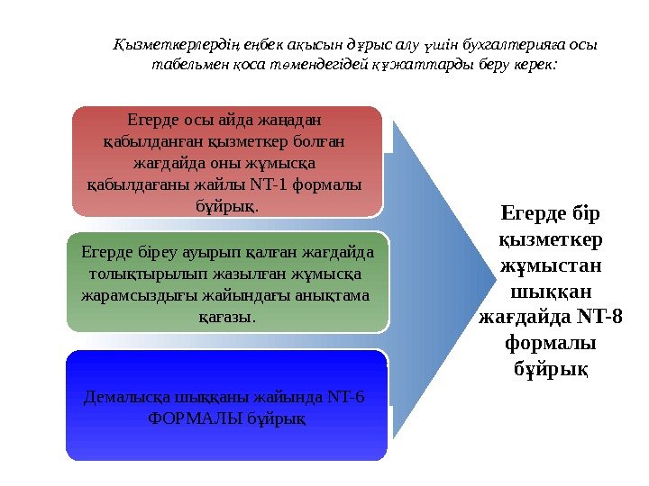 ызметкерлерді е бек а ысын д рыс алу шін бухгалтерия а осы Қ ң ң қ ұ ү ғ табельмен оса т мендегідей жаттарды беру керек: қ ө құ Егерде осы айда жа адан ң абылдан ан ызметкер бол ан қ ғ жа дайда оны ж мыс а ғ ұ қ абылда аны жайлы NT-1 формалы қ ғ б йры. ұ қ Егерде біреу ауырып ал ан жа дайда қ ғ ғ толы тырылып жазыл ан ж мыс а қ ғ ұ қ жарамсызды ы жайында ы аны тама ғ ғ қ а азы. қ ғ Демалыс а шы аны жайында NT-6 қ ққ ФОРМАЛЫ б йры ұ қ Егерде бір ызметкер қ ж мыстан ұ шы ан ққ жа дайда NT-8 ғ формалы б йры ұ қ