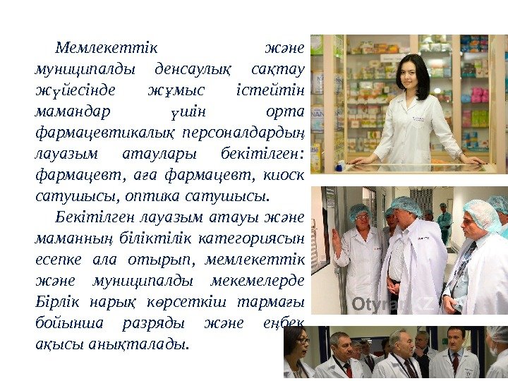 Мемлекеттік ж не ә муниципалды денсаулы са тау қ қ ж йесінде ж мыс істейтін ү ұ мамандар шін орта ү фармацевтикалы персоналдарды қ ң лауазым атаулары бекітілген: фармацевт, а а фармацевт, киоск ғ сатушысы, оптика сатушысы. Бекітілген лауазым атауы ж не ә маманны біліктілік категориясын ң есепке ала отырып, мемлекеттік ж не муниципалды мекемелерде ә Бірлік нары к рсеткіш тарма ы қ ө ғ бойынша разряды ж не е бек ә ң а ысы аны талады. қ қ