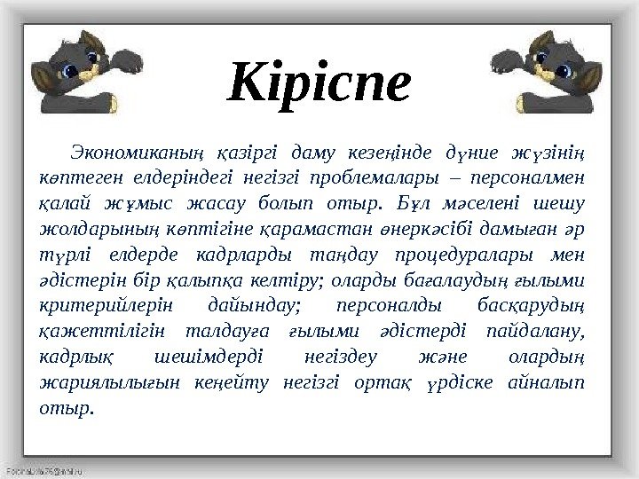 Кіріспе Экономиканы азіргі даму кезе інде д ние ж зіні ң қ ң ү ү ң к птеген елдеріндегі негізгі проблемалары – персоналмен ө алай ж мыс жасау болып отыр. Б л м селені шешу қ ұ ұ ә жолдарыны к птігіне арамастан нерк сібі дамы ан р ң ө қ ө ә ғ ә т рлі елдерде кадрларды та дау процедуралары мен ү ң дістерін бір алып а келтіру; оларды ба алауды ылыми ә қ қ ғ ң ғ критерийлерін дайындау; персоналды бас аруды қ ң ажеттілігін талдау а ылыми дістерді пайдалану, қ ғ ғ ә кадрлы шешімдерді негіздеу ж не оларды қ ә ң жариялылы ын ке ейту негізгі орта рдіске айналып ғ ң қ ү отыр.