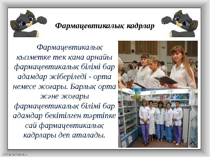Фармацевтикалы қ ызметке тек ана арнайы қ қ фармацевтикалы білімі бар қ адамдар жіберіледі — орта немесе жо ары. Барлы орта ғ қ ж не жо ары ә ғ фармацевтикалы білімі бар қ адамдар бекітілген т ртіпке ә сай фармацевтикалы қ кадрлары деп аталады. Фармацевтикалы кадрлар қ