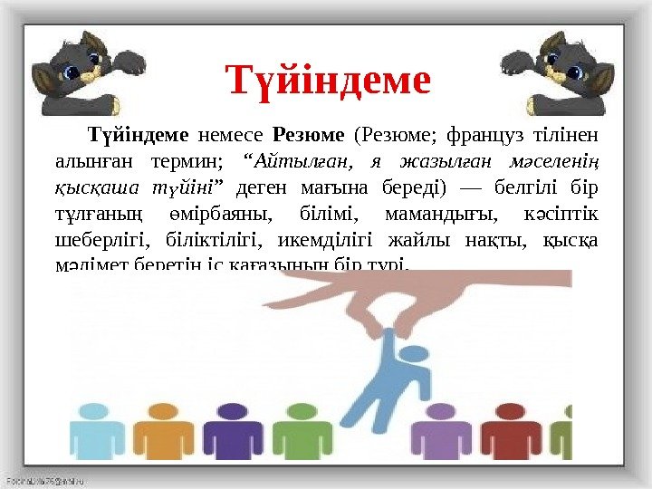 Т йіндеме жаз ан адам ү ғ туралы толы м лімет беру қ ә шін онда, оны білімі, ү ң біліктілігі, жеткен жетістігі, ж мыс т жірибесі, не ұ ә н рсеге икемділігі бар екені ә жазылу керек. Т йіндеме ке ү ң к лемдегі визит карточка ыз ө ң іспеттес. Т йіндемені ерекшелігі – ү ң міткерді білімі ж не к сіби ү ң ә ә шеберлігі туралы м ліметтерді кері ә ң хронологиялы т ртіпте қ ә берілуі.