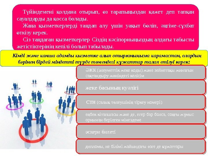 Т йіндемені олдана отырып, з тарапы ыздан ажет деп тап ан ү қ ө ң қ қ сауалдарды да осса болады. қ Жа а ызметкерлерді та дап алу шін уа ыт б ліп, гіме-с хбат ң қ ң ү қ ө әң ұ ткізу керек. ө Сіз та да ан ызметкерлер Сізді к сіпорны ызды алда ы табысты ң ғ қ ң ә ң ң ғ жетістіктеріні кепілі болып табылады. ң Кімді ж не анша адамды ызметке алып отыр аны ыз а арамаcтан, оларды ә қ қ ғ ң ғ қ ң б рінен бірдей міндетті т рде т мендегі жаттар талап етілуі керек: ә ү ө құ ЖК ( леуметтік жеке коды) ж не зейнета ы жина ын Ә ә ә қ ғ са тандыру ж ніндегі келісім қ ө жеке басыны ку лігі ң ә СТН (салы т леушіні тіркеу номері) қ ө ң е бек кітапшасы ж не де, егер бар болса, со ы ж мыс ң ә ңғ ұ орнынан берілген мінездеме скери билеті ә дипломы, не білімі жайында ы зге де жаттары ғ ө құ