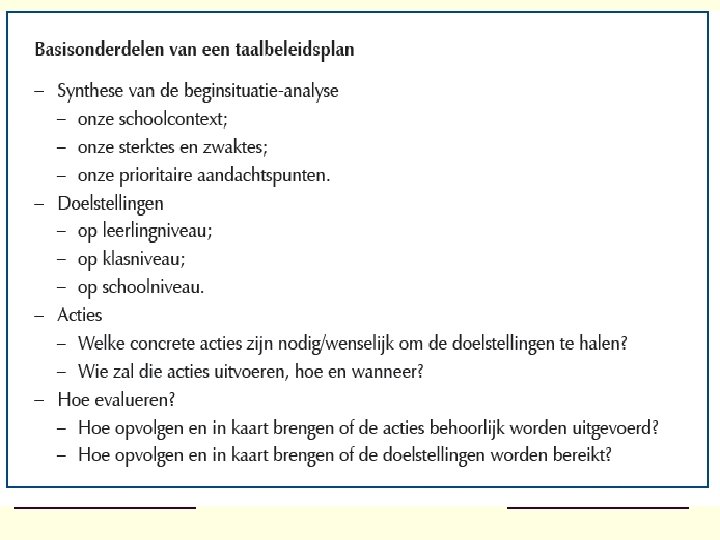 Taalbeleid krijgt op de basisschool systematisch vorm als een schoolteam: n bewust stilstaat bij wat alle leden van het team concreet met taal doen en zich afvraagt hoe effectief en efficiënt dat is voor de ontwikkeling van de leerlingen; n beslist aan welke problemen en zwaktes prioritair aandacht moet geschonken worden; n voor die prioritaire aandachtspunten doelstellingen bepaalt en aan die doelstellingen gepaste acties verbindt; n die acties met alle betrokkenen probeert uit te voeren; n het effect van die acties evalueert en waar nodig bijstuurt. PLANMATIGHEID – TEAMWERKING - SAMENHANG