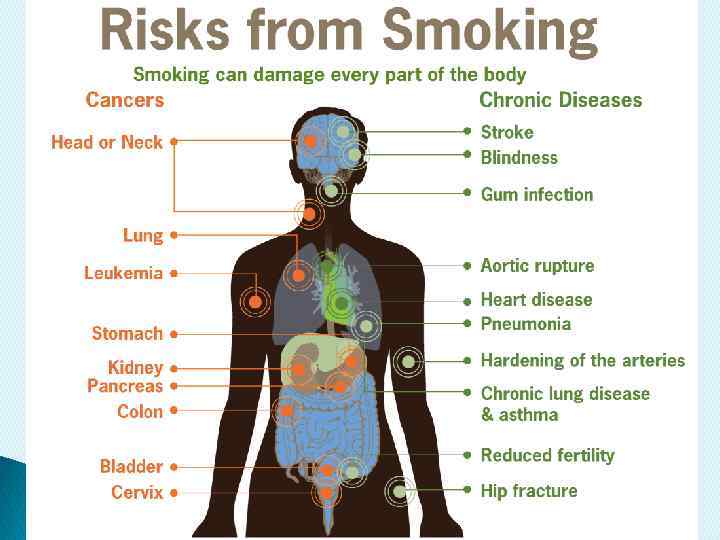 Эпидемиология Табакокурение является единственной(из основных) наиболее легко устранимой причиной преждевременной смерти населения. В настоящее время табакокурение широко распространено во всех странах мира и является одной из ведущих причин таких заболеваний, как рак легких, рак ротовой полости, пищевода и многих других локализаций; сердечно-сосудистой патологии, хронических заболеваний легких, эректильной дисфункции, бесплодия, врожденных дефектов и многого др. По американской статистике около 70% курильщиков обращаются к врачу каждый год. В Республике Беларусь – 90 -100%.