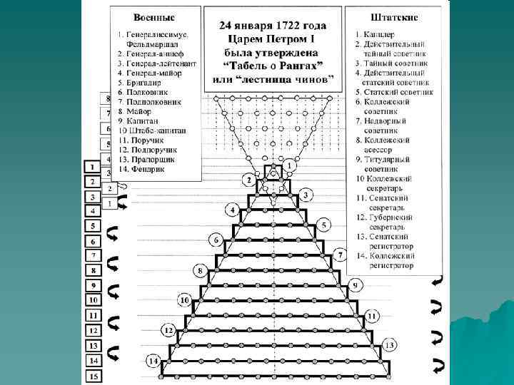 Окончательная редакция табели о рангах. u Структура текста Табели делится на 2 части: систематизированная таблица, включающая всего 262 должности военных (126), гражданских (94) и придворных (42) чинов. Они были определены по 14 классам. При этом 11 й класс включал лишь одну должность корабельного секретаря. Но, видимо, из суеверных соображений решили не использовать "чертову дюжину" для нумерации рангов.