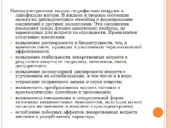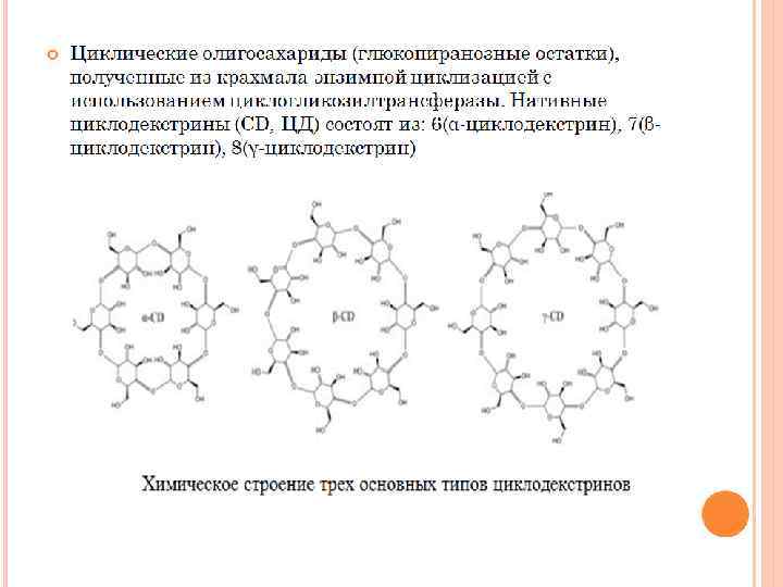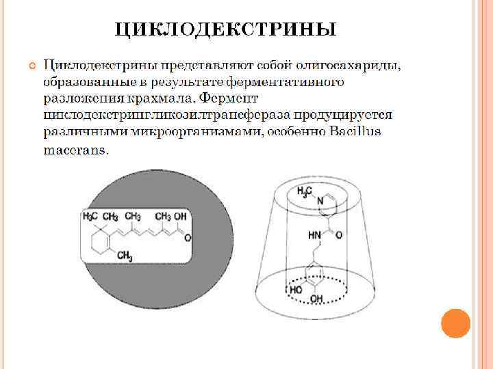 КОМПЛЕКСЫ ВКЛЮЧЕНИЯ: ПОНЯТИЕ И МЕХАНИЗМ ОБРАЗОВАНИЯ ВКЛЮЧЕНИЯ Комплексы включения лекарственных веществ с циклодекстринами используют для моделирования лиганд рецепторных взаимодействий, а также для повышения стабильности, растворимости и биологической доступности лекарственных веществ. Гидрофобная полость циклодекстринового кольца может вмещать в себя подходящую молекулу «гостя» и образовывать комплекс. В комплексах включения одна или несколько молекул гостя (или субстрата) включаются (инкапсулируются) в другие молекулярные структуры и удерживаются в них. Комплексы включения содержат в себе гидрофобные межмолекулярные взаимодействия сходные с теми, что содержатся во многих биологических системах (фермент/субстрат; антиген/антитело). Необходимым условием для образования комплекса включения является то, что «гость» должен быть подходящего размера и формы для включения в полость «хозяина» .