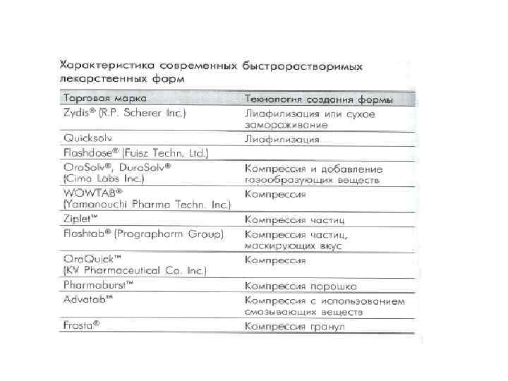 Технология создания быстрорастворимых/быстрораспадающихся пероральных ЛФ ü лиофилизация или сухое замораживание, ü сухая компрессия ЛВ в виде порошка или компрессия гранул, окруженных оболочкой, ü использование носителей, ü включением дополнительных веществ, способствующих быстрому распаду таблетки или потенцирующих всасывание.