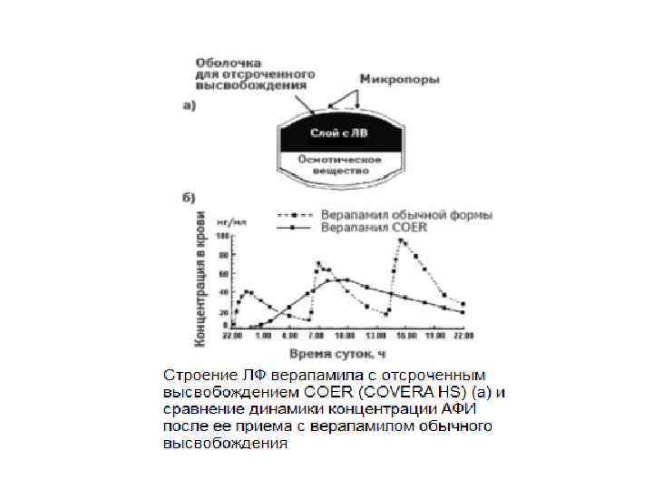 ТЕХНОЛОГИЯ OROS® (OROS® Delayed Push-Pill System, Alza Corp. ) • В ней дополнительно под полупроницаемую наружную оболочку вводится слой полимерного вещества, обеспечивающего латентный период требуемой продолжительности (4 5 ч) и отсроченное начало действия таблетки (controlled onset extended release— COER). Такие ЛФ, принятые в вечернее время, позволяют создавать опти мальные концентрации препарата в уязвимые периоды суток, например, ранние утренние часы, когда высок риск развития приступов заболевания (приступ бронхи альной астмы, сердечные приступы и т. д. ). Модификация L-OROS®