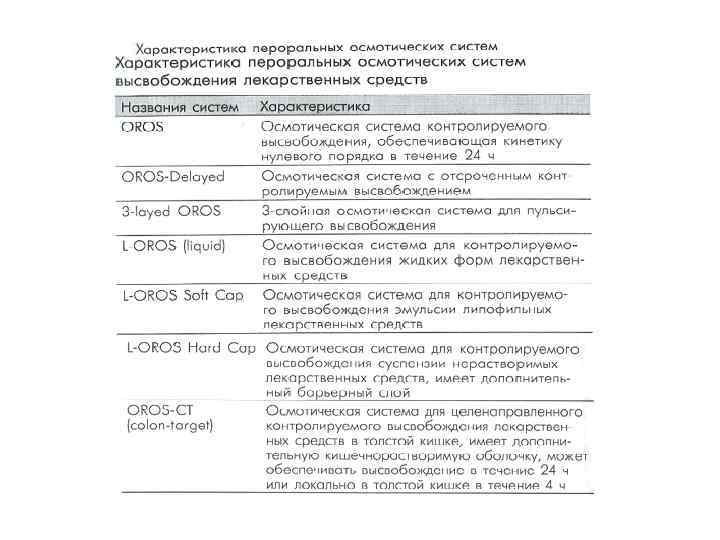 ПЕРОРАЛЬНЫЕ ОСМОТИЧЕСКИЕ СИСТЕМЫ Пероральные осмотические системы действуют на основе простейших осмотических насосов (OROSTM, Alza Corp. ). Их используют для высвобождения ЛВ, находящихся в твердом состоянии, но способных образовывать насыщенные растворы. Система имеет общий резервуар для ЛВ и осмотического вещества, или же само ЛВ играет роль осмотического вещества. Резервуар содержит отверстие, которое выполняется с помощью лазерного луча диаметром 300 500 микрон. Через ригидную полупроницаемую оболочку, окружающую резервуар, вода поступает из ЖКТ, образуя насыщенный раствор ЛВ и создавая осмотическое давление, в результате которго растворенное ЛВ выдавливается из отверстия со скоростью, равной скорости проникновения жидкости в систему. По мере выхода растворенной части ЛВ новая порция воды, поступающая в резервуар, дальше растворяет ядро из ЛВ и т. д.