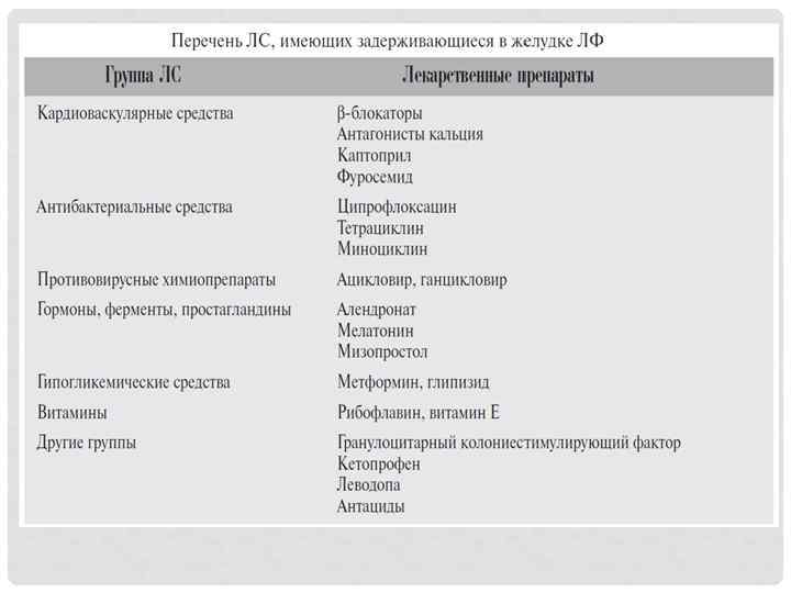 Основные направления модификации пероральных систем доставки ЛС: облегчение процесса перорального приема для преодоления проблем, связанных с глотанием, и других состояний, маскирования вкуса ЛС и т. п. ; задерживание в желудке ЛФ для преодоления быстрого времени транзита в верхних отделах ЖКТ; улучшение всасывания ЛС в тонкой кишке (например, для плохорастворимых ЛС или Л С с высокой молекулярной массой); обеспечение целенаправленной доставки и высвобождения в разных отделах ЖКТ.