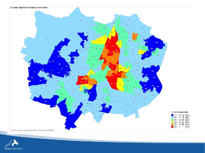 The scale of fuel poverty in Coventry • Coventry’s fuel poverty rate stands at 15. 9% • 6 th highest level of fuel poverty of all local authorities in England • 195 neighbourhood level LSOAs: - in 10%, 1 in 3 households fuel poor - highest: 43% (Gosford and Gulson Rds)
