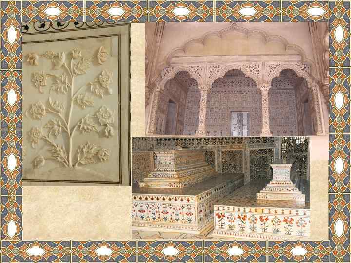 Абстрактные формы используются повсюду, особенно в постаменте, минаретах, воротах, мечети, и даже на поверхностях могилы. На более низких уровнях усыпальницы нанесены реалистичные мраморные фигуры цветов и виноградных лоз. Все эти изображения отполированы и инкрустированы камнями, такими как желтый мрамор, яшма и нефрит.