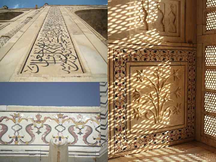 Архитектура Все стены инкрустированы драгоценными и полудрагоценными камнями, отчего при солнце или луне стены отражают их свет. Со всех сторон Тадж. Махал окружает, а прямо перед зданием расположен обширный мраморный бассейн, в водах, при определённом ракурсе, отражается всё сооружение.