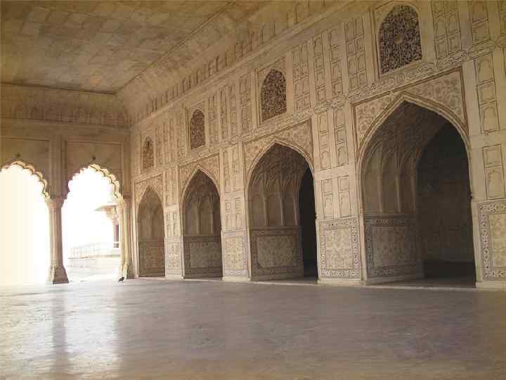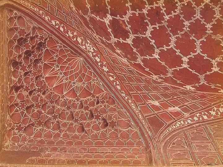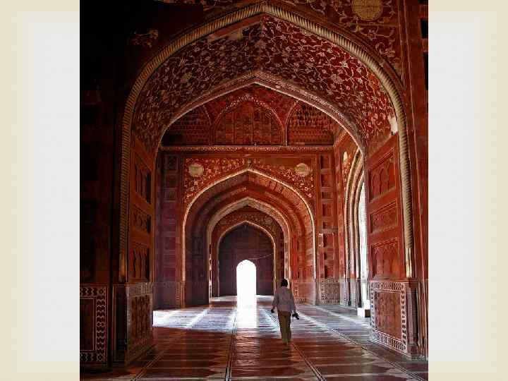 Архитектура С левой стороны от усыпальницы находится мечеть из красного песчаника. Справа точная копия мечети. Весь комплекс имеет осевую симметрию. Усыпальница имеет центральную симметрию относительно гробницы Мумтаз-Махал. Нарушает эту симметрию лишь гробница Шах-Джахана, которую там соорудили после его смерти.
