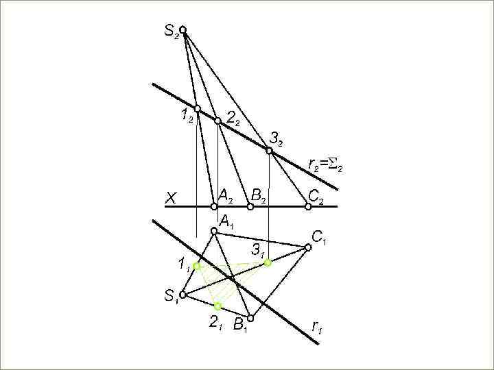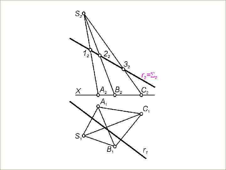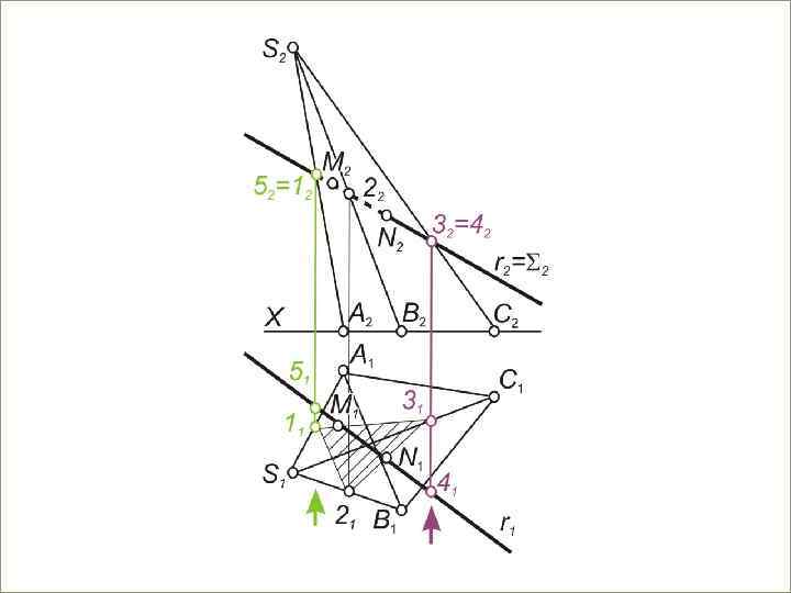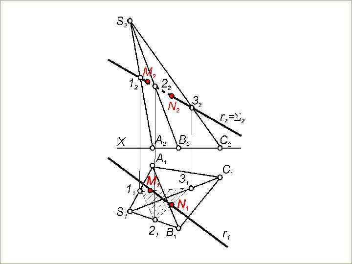 Пересечение многогранника прямой линией Пример. n Дано: пирамида SABC (S 1 A 1 B 1 C 1, S 2 A 2 B 2 C 2) и прямая r(r 1, r 2). n Построить: M, N=r (SABC).