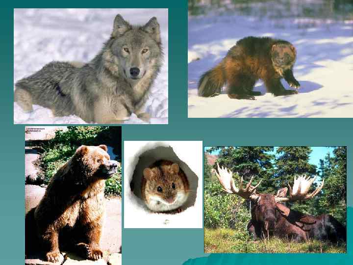 Фауна (животные) u u u Животный мир тайги богаче и разнообразнее, чем животный мир тундры. Многочисленны и широко распространены: рысь, росомаха, бурундук, куница, соболь, белка и др. Из копытных встречаются северный и благородный олени, лось, косуля; многочисленны грызуны: бурозубки, мыши. Из птиц обычны: глухарь, рябчик, кедровка, клесты и др. Для тайги Северной Америки типичны американские виды тех же родов, что и в Евразии.