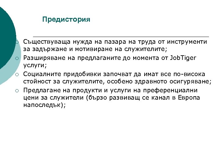 Предистория ¡ ¡ Съществуваща нужда на пазара на труда от инструменти за задържане и мотивиране на служителите; Разширяване на предлаганите до момента от Job. Tiger услуги; Социалните придобивки започват да имат все по-висока стойност за служителите, особено здравното осигуряване; Предлагане на продукти и услуги на преференциални цени за служители (бързо развиващ се канал в Европа напоследък);