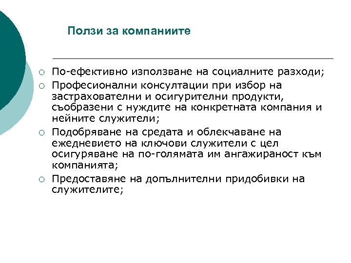 Ползи за компаниите ¡ ¡ По-ефективно използване на социалните разходи; Професионални консултации при избор на застрахователни и осигурителни продукти, съобразени с нуждите на конкретната компания и нейните служители; Подобряване на средата и облекчаване на ежедневието на ключови служители с цел осигуряване на по-голямата им ангажираност към компанията; Предоставяне на допълнителни придобивки на служителите;