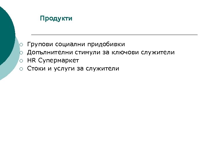 Продукти ¡ ¡ Групови социални придобивки Допълнителни стимули за ключови служители HR Супермаркет Стоки и услуги за служители