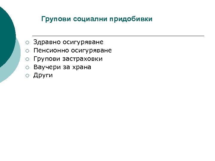 Групови социални придобивки ¡ ¡ ¡ Здравно осигуряване Пенсионно осигуряване Групови застраховки Ваучери за храна Други