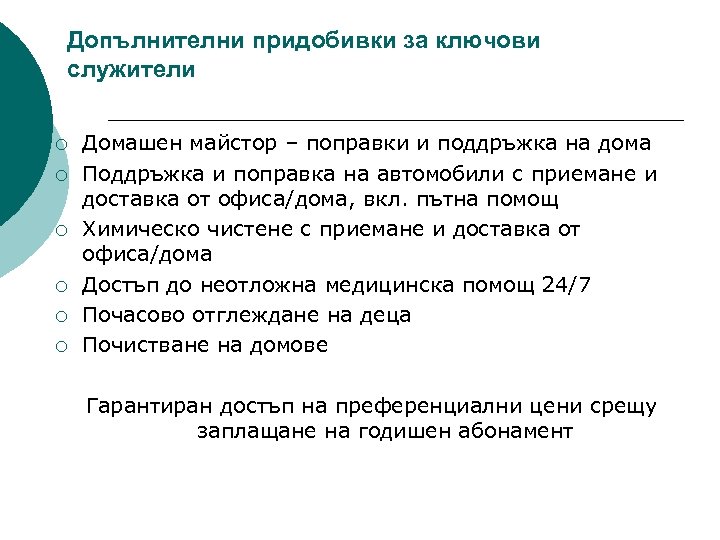 Допълнителни придобивки за ключови служители ¡ ¡ ¡ Домашен майстор – поправки и поддръжка на дома Поддръжка и поправка на автомобили с приемане и доставка от офиса/дома, вкл. пътна помощ Химическо чистене с приемане и доставка от офиса/дома Достъп до неотложна медицинска помощ 24/7 Почасово отглеждане на деца Почистване на домове Гарантиран достъп на преференциални цени срещу заплащане на годишен абонамент