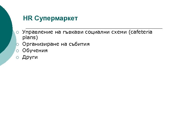 HR Супермаркет ¡ ¡ Управление на гъвкави социални схеми (cafeteria plans) Организиране на събития Обучения Други