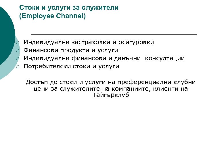 Стоки и услуги за служители (Employee Channel) ¡ ¡ Индивидуални застраховки и осигуровки Финансови продукти и услуги Индивидуални финансови и данъчни консултации Потребителски стоки и услуги Достъп до стоки и услуги на преференциални клубни цени за служителите на компаниите, клиенти на Тайгърклуб