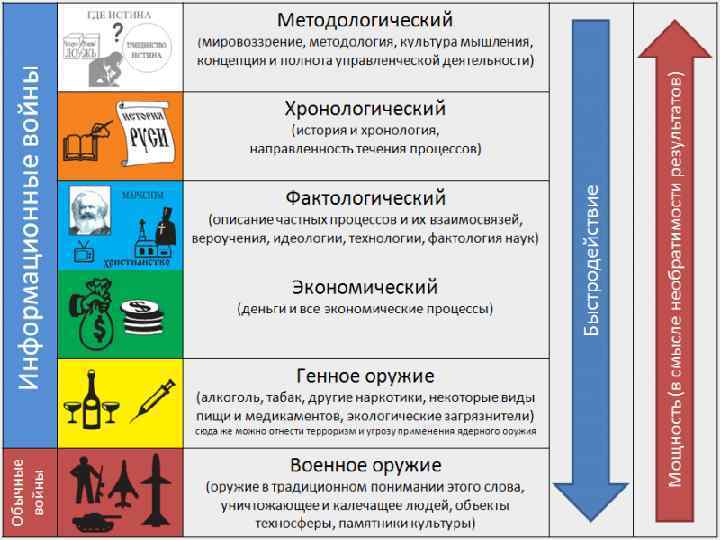 Мировоззренческое оружие Подмена мировоззрения приводит к катастрофическим последствиям для того или иного народа, он теряет свою самобытность, нравственно этическую сущность, что в итоге приводит его к гибели. Это медленное оружие, но самое мощное.