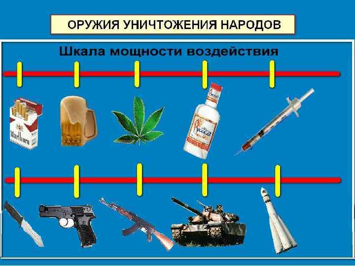 Оружие геноцида Средства геноцида, поражающие не только живущих, но и последующие поколения. Ядерный шантаж, алкогольный, табачный и прочий наркотический геноцид, пищевые добавки, все экологические загрязнители, некоторые медикаменты; «генная инженерия» и «биотехнологии» .